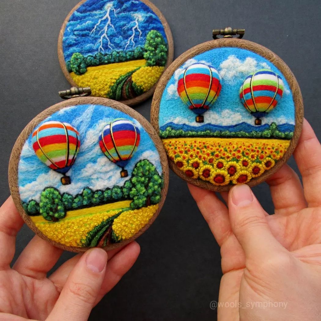 Начинала пробовать себя в валянии с игрушек. Мне нравилось наблюдать за трансформацией материала. Потом захотелось сделать брошь с рисунком. Почему? Неизвестно. Помню только, что я хотела сделать брошь с лебедем, и она не получилась. С поры, когда я интересовалась живописью, у меня были книги с акварельными пейзажами, и тогда в голову пришла идея нарисовать один из них, но шерстью и в виде броши. Думаю, это судьба. Потому что сама не могу ответить себе на этот вопрос, ведь украшениями я не интересовалась и пейзаж сделать было идеей спонтанной. Но я так окрылилась и была в восторге от результата и своей придумки. Это уже потом, выйдя на просторы интернета, я узнала, что есть невероятные броши-пейзажи Лизы Джордан и других мастеров, и что открытия я никакого не совершила. Но радости это не поубавило, ведь я нашла свой путь. Были и кулоны с пейзажами, в планах колье, браслеты, но броши - это главная тема моего дела. Ведь так здорово, когда человек имеет у самого сердца частичку того, что особенно любит.