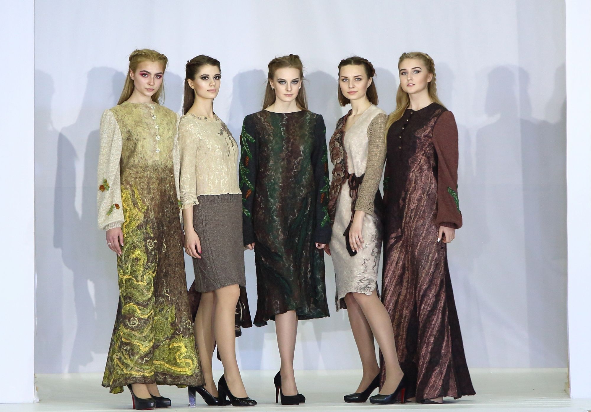 Результатом первых совместных работ стали валяно-вязано-вышитые комплекты – шапка+снуд+варежки. Получилось ярко и классно. Нам понравилось, и мы сразу же взялись за дело. И вот, спустя два с лишним месяца родилась наша первая коллекция платьев. Назвали мы ее «Таежный хоровод», ну и это понятно почему – шишки, елки, ветки, и вся тайга, с ее изобилием прекрасного и волшебного.